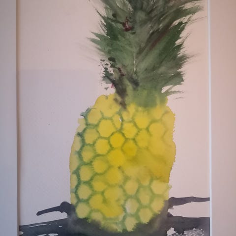 Maleri som viser et stilleben med en mørk flaske og to røde epler plassert på en stol med et hvitt og rødt klede. Bildet har varme farger og en realistisk stil. Akvarell på papir, måler med passepartout 40x50 cm. Kunstner er Viktoria Jensen Tsyrlinskaya