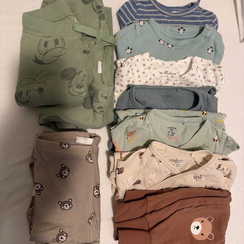 Stor klespakke i størrelse 62. Klær fra Newbie, Hummel, Cubus, Lindex etc. Flere av bodyene og buksene er sett. Fra røyk og dyrefritt hjem.