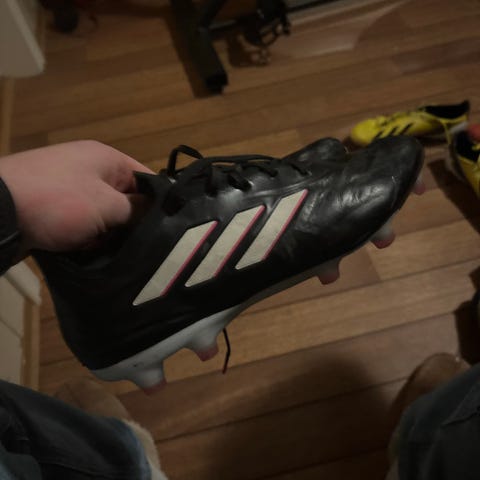 Adidas fotballsko i størrelse 41 1/3 med gult og blått fargevalg. Skoene har knotter for bruk på gressbaner/kunstgress.