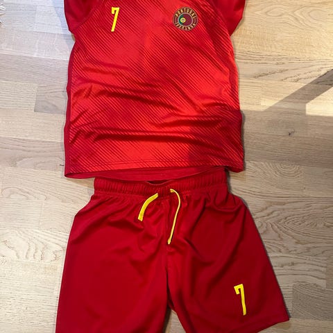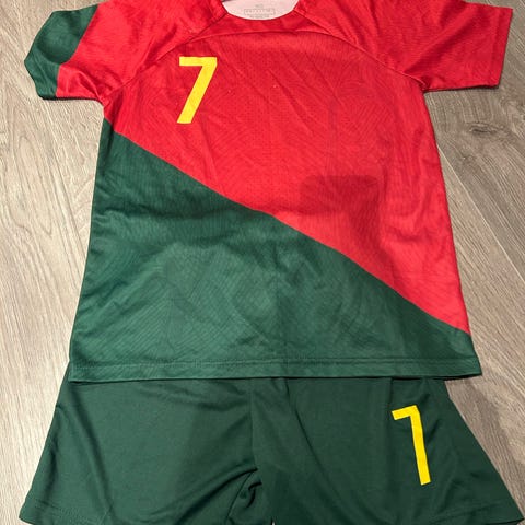 Nike Fotballdrakt for barn i størrelse 134 (9-10år) med rød og grønn farge. Drakten inkluderer trøye og shorts, med nummer 7 og navn Ronaldo på ryggen. Egnet for fotballaktiviteter. ikke original