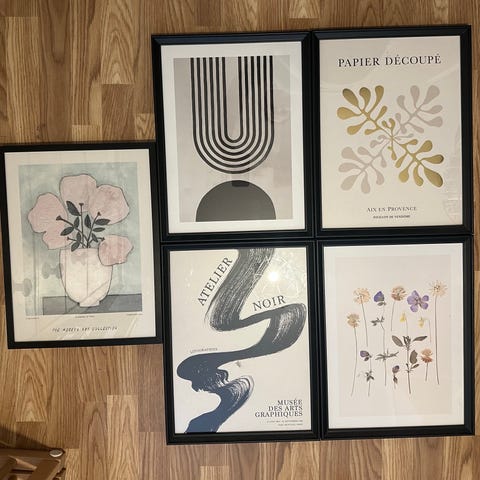 IKEA plakater med abstrakte former. Settet består av to plakater med motiv av geometriske former i jordfarger. Plakatene har svart ramme. Merk at jeg har kjøpt to ulike rammer ved en feil. Kan derfor også selge de seperat om ønskelig. Må hentes på Thune.