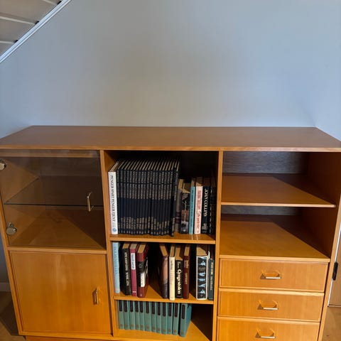 Utrolig fint teak skap med ett åpent rom og en klaff med åpent rom bak. Møbelet har ingen skader eller riper av noe slag og undetstell er i teak. Beinas høyde er 19 cm. Dette møbelet kan ikke sendes med post, men det finnes mange private transportløsninger som kan benyttes.
