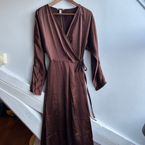 Nelly Festkjole i størrelse S, flerfarget og laget av polyester. Kjolen har lange ermer og en knute-detalj i midjen.