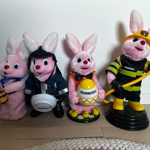 Duracell Batterikanin Dukke Sett i rosa stoffmateriale. Settet inkluderer to kanindukker med forskjellige antrekk, en med kamera og en med Duracell-logo på klærne. Passer som samlerobjekt eller dekorasjon.
