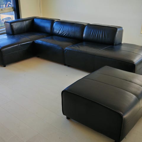 Sofaen er pent brukt, men det er noe synlig slitasje: skinnet har begynt å revne enkelte steder på setene. Dette påvirker ikke funksjonen, og sofaen har fortsatt mye brukstid igjen. Trekk følger med, noe som både beskytter sofaen og gir mulighet for et nytt uttrykk.