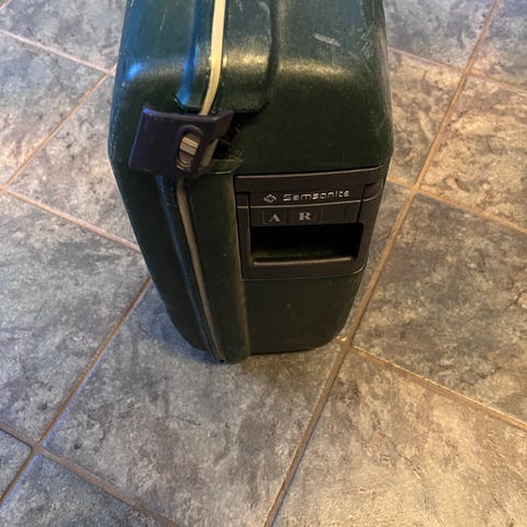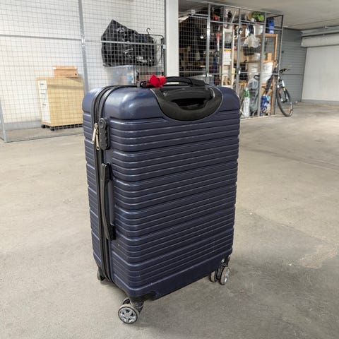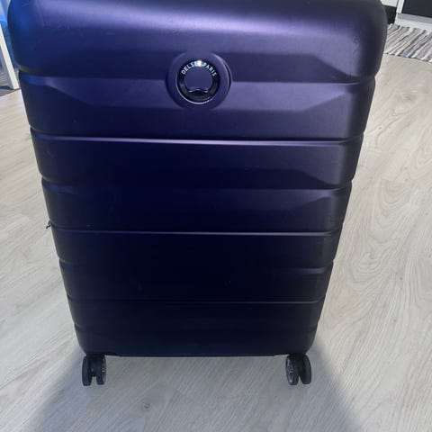 Samsonite plast koffert i blå farge, designet for unisex bruk. Kofferten har hjul og håndtak for bæring og transport.