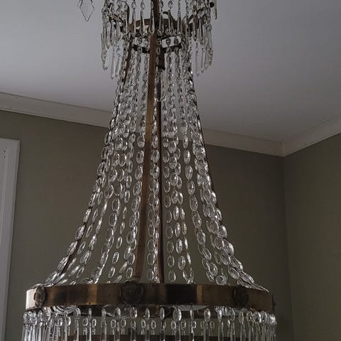 Elegant og tung krystallkrone med rikelig med prismer som gir flott lys og glans. Klassisk og tidløs lampe som passer godt i stue, spisestue eller hall med god takhøyde.