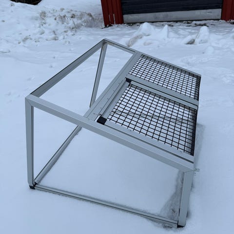 Solid konstruksjon av aluminium og tre. Null knirking. Buret har en dør med låsbar åpning og «nødutgang» inn mot seteryggen i tilfelle påkjørsel bakfra. på sidene.