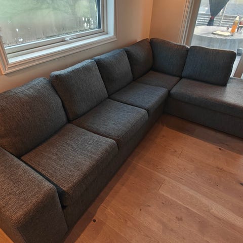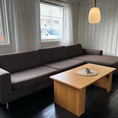 Hjørnesofa. Nylig renset. Har noen skjolder, men ellers pent brukt.