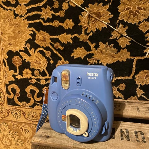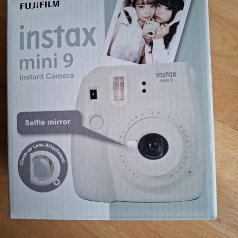 Fujifilm Instax Mini 9 instaxkamera i mintgrønn farge. Kameraet bruker umiddelbar film for å gi fysiske bilder umiddelbart etter fotografering. Modellen har innebygd selfie-speil og er designet for enkel bruk.