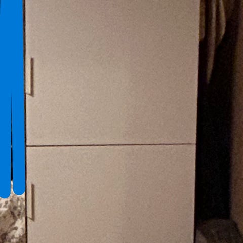 Sort smalt skap som egentlig er veldig fint, men ikke i nåværende tilstand. Når det vaskes så er det igjen kun noe maling langs sidene som er ved veggen, for å få det tilbake til en nydelig skap igjen. Jeg tror skapet kan være fra "Black design"?