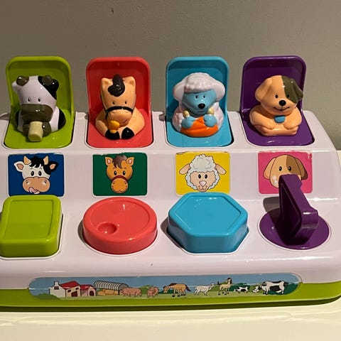 Aktivitetsleker, samt to puslespill med dyremotiv og bondegårdsmotiv, pluss en magnetisk tegneplate med håndtak og snor. Egnet for små barn, laget i plast med flere farger.