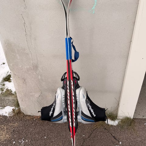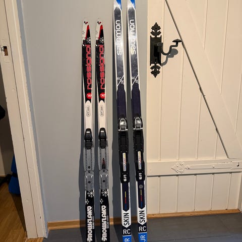 Madshus langrennsski med tilhørende bindinger og støvler. Støvlene er med snøring og borrelås. Smørefrie. Str 26 på sko.