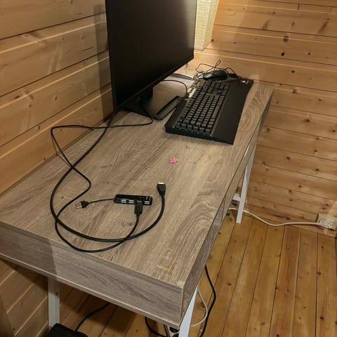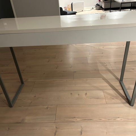 Vi gir bort et brukt skrivebord med litt slitasjemerker på bordplaten. Fint som et lite opp-pussingsprosjekt! Du får også med en helt fin frittstående høy og smal hylle som hører til.