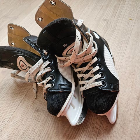 Hockeyskøyter for barn i størrelse 26. Skøytene er laget for ishockeysport og lukkes med regulerbare spenne for å sikre stabilitet rundt ankelen for de minste.