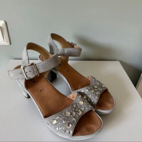 Svart lakksko med spiss tå og lav hæl i størrelse 38. Skoen har glidelås på siden for enkel påkledning. Materialet er blankt skinnimitasjon som gir en glatt og skinnende overflate.