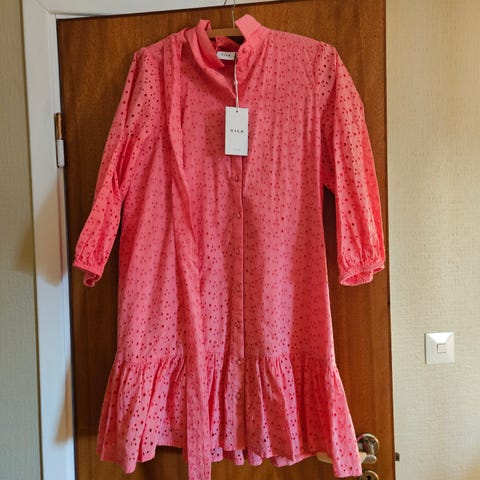 Lindex Holly & Whyte kjole til spesiell anledning i størrelse L. Kjolen er beige og laget av polyester. Den har detaljer i blonder og en knapp på baksiden. Passer for kvinner.