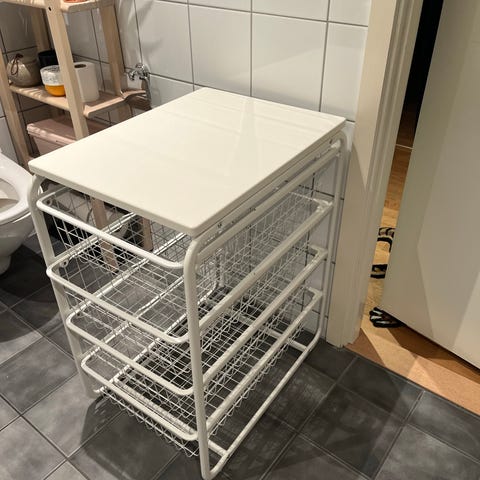 Boksene er grå. Selve kommoden er hvit. Selges på grunn av oppussing. Har vært god å bruke til oppbevaring i gangen med alle votter og luer.