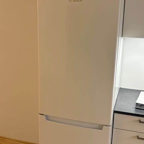 Bosch kombiskap med kjøleskap og fryser i ett. Hvit farge og standard størrelse for kjøkkenbruk.