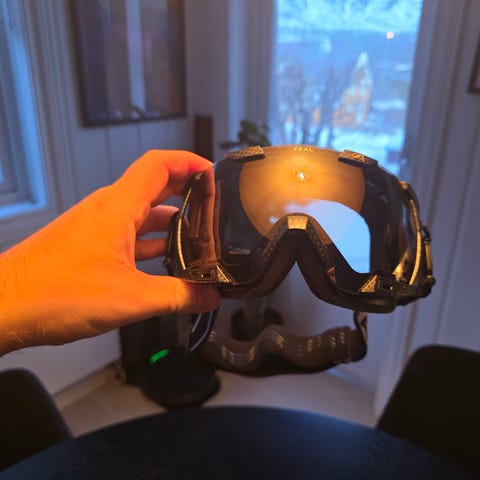 Tilstandsvurdering: Paret er pent brukt i 6 skidager, og linsen er i god stand. På nært hold, om du leter, så ser du at det er noen hårsår i coatingen. De er bitte små. Dette er uungåelig og kommer på alle briller etter noen dagers bruk. Paret har fått en liten stripe i rammen, denne har jeg farget over med tusj og pusset med klut så du skal vite at den er der for å se det. Stroppen er i veldig god stand.