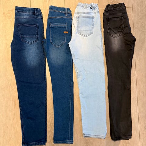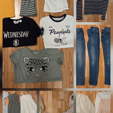 Klespakke til jente str. 146/152. Pent brukt og i god stand! Inneholder jeans, bukser, varme gensere, langermede bomullsgensere, treningskort, pensko, pysj og kjoler.