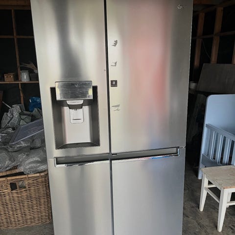 LG Side-by-Side kjøleskap i rustfritt stål. Fryser på venstre del og kjøleskap på høyre del. Vanntank til isbitmaskin.