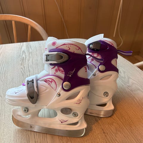 Rosa/hvite/svarte hockeyskøyter selges. Justerbar størrelse (str. 30-33). To klemmer fremme, som kan justeres, styrer hvor stram skøyten sitter på foten.Merke: Pro Flyer Girl. Brukt noen ganger.