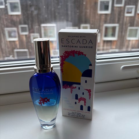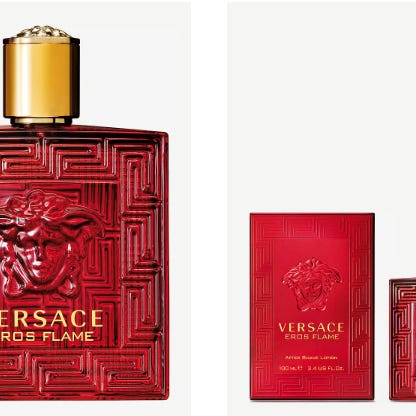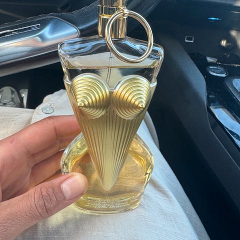 Parfymflaske i gull og svart farge. Flaske med rektangulær form og et elegant design.