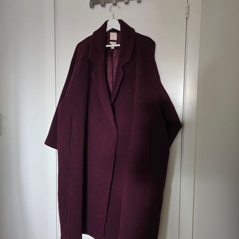 Foret/kåpe i 60i ull, lilla farge, størrelse 36 for dame. Jakken har usynlig knappelukking og lommer, egnet både vår, høst og vinter.