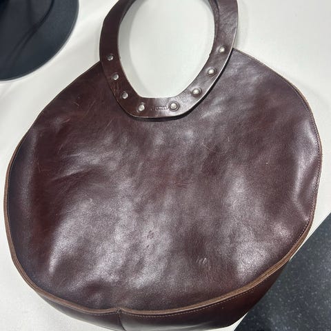 Gullfarget clutch/selskapsveske i skinn. Den kan åpnes øverst og brettes ned, og det er et eget rom med glidelås, som vist på det ene bildet. Den er helt ubrukt, fordi jeg har to😬 merke: Iacucci, fra Italia.