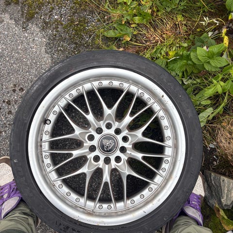 Eldre felger med gode dekk. Lagret inne i noen år. Vet ikke hvilke bil de passer, eller hva diameter på senter hullet er. Kan hentes i Skien, eller leveres i Kongsberg området