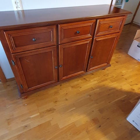 Ingen store slitasjemerker eller skader på skapene eller benkeplaten.