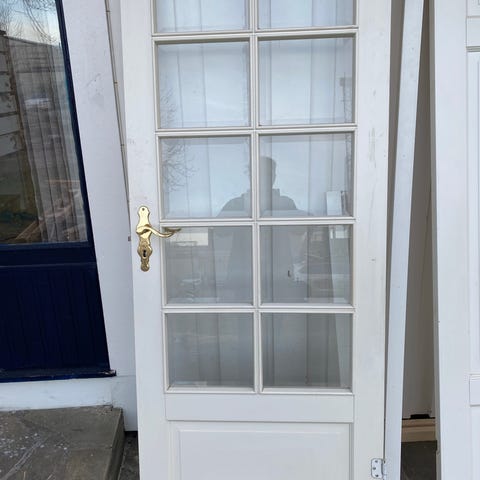 Innvendig dør i hvit farge med glassfelt delt i seks ruter. Døren har to paneler nederst og metallhåndtak. Passer til bruk som romdør innendørs.