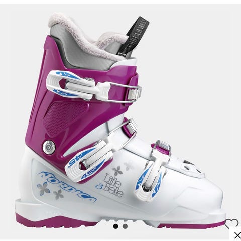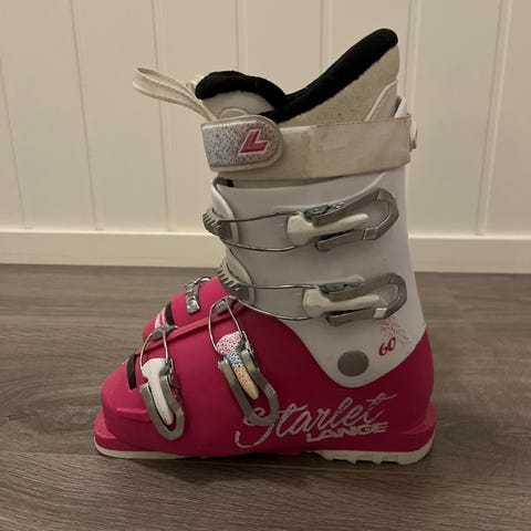 Selger Roxa Starlet alpinstøvler i rosa og hvit farge, kun brukt noen få ganger. Støvlene har fire metallspenner og borrelåsfeste.