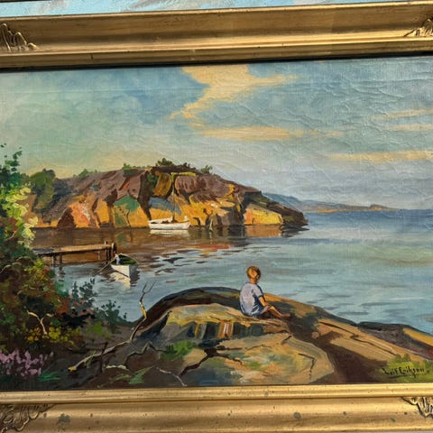 Sjekker interessen for dette maleriet. Thorvald torgersen maleri fra 1926 som viser to gutter sittende på en stein ved sjøen. Maleriet har detaljerte penselstrøk og er innrammet.