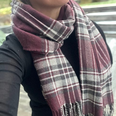 26,5cmx 1,36 m skjerf i beige med brunt mønster. Er ubrukt.