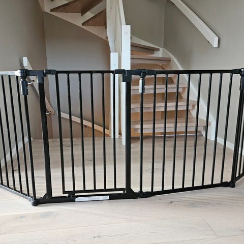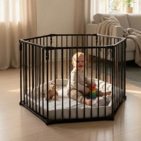 Yngri 3-i-1 grind: barnegrind, peisbeskytter og lekegrind i svart metall selges.