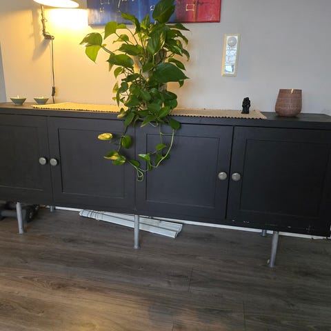Benk til kjøkken eller stue med plass til vinflasker og oppbevaring. Hjul på to av bena. Må hentes på Skullerud.