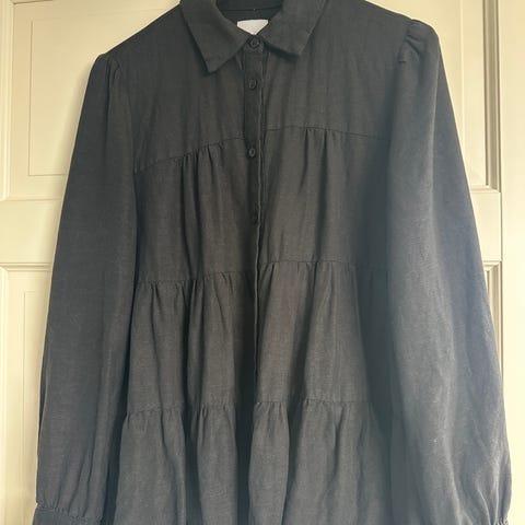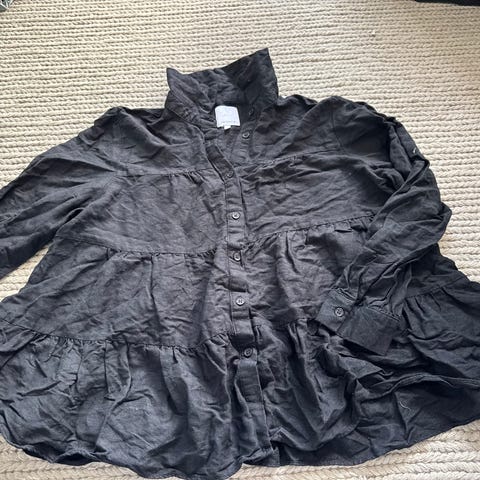 Ane Mone bluse i størrelse 38, laget av lin. Blusen er hvit og har detaljer med volanger. Den har lange ermer og en V-formet utringning med rysjer.