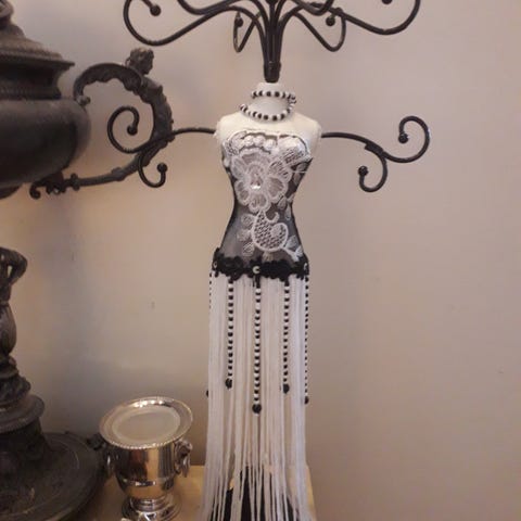 Smykke-mennekeng, dame med hvit kjole, 6 knagger til ringer, kjeder, armbånd, ankelkjede,