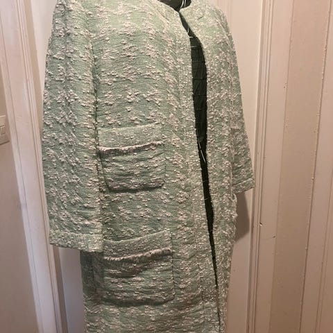 Zara jakke i lys grønn farge, laget av bomull. Jakken har størrelse XL og er litt kortere modell. Tweed stoff med gullknapper