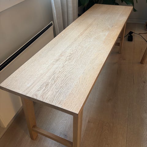 Selger en superfin bordplate i Eik fra jysk i modell Kliplev, den passer til understell til diverse. Vi har laget vår eget under stell så noen treplater under bordet er limt på med tre lim. Disse fjernes av kjøper, og selges derfor billig. Platen ser helt fin ut på over flaten, kantene er litt slitt, men ikke noe man legger merke til eller ikke kan fikses om en har tid og vilje.