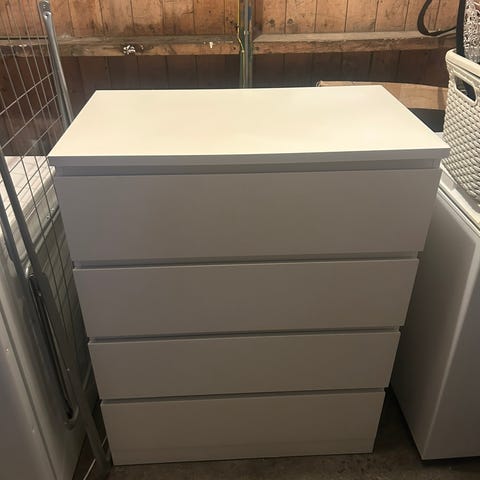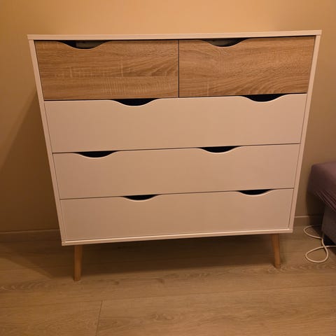 Koppang kommode pent brukt, bortsett fra «flekken» som er vist på bildet. To hvite knagger limt på den ene siden, som vist på bildet. Må hentes.