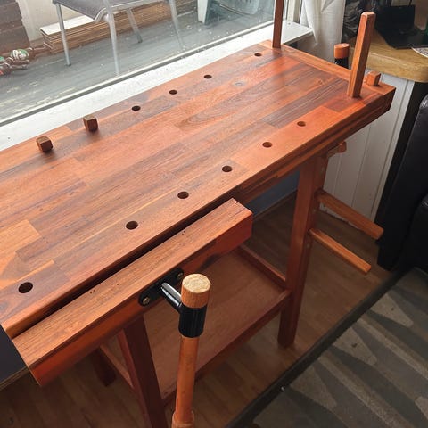 Solid arbeidsbenk i tre. Malt overflate på topp pga den har blitt brukt til oppbevaring/lagring i kjeller.