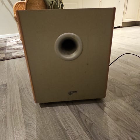 Bass Habit bass subwoofer med tilhørende forsterker. Subwooferen har en sylinderformet design med svart stofftrekk og rødt logo. Forsterkeren har flere tilkoblingsmuligheter, inkludert RCA-innganger og justeringsknapper for lydinnstillinger.