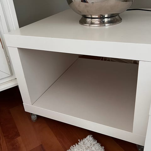 Solid bord med sveist understell av metall. Bordet har vore utstillingsbord i butikk, men har også fungert fint som arbeidsbord og til oppbevaring. Romslege hyller og gode hjul som gjer det lett å flytte rundt på bordet. Mørkgrå beisa treverk.