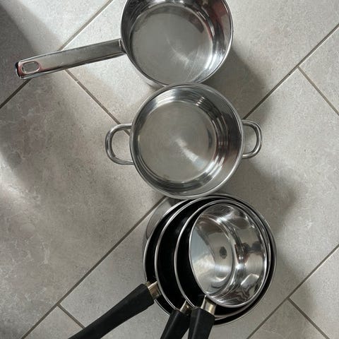 Gryte med lokk og kurv selges. Egnet for bruk på kjøkkenet til tilberedning og servering av mat.
