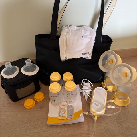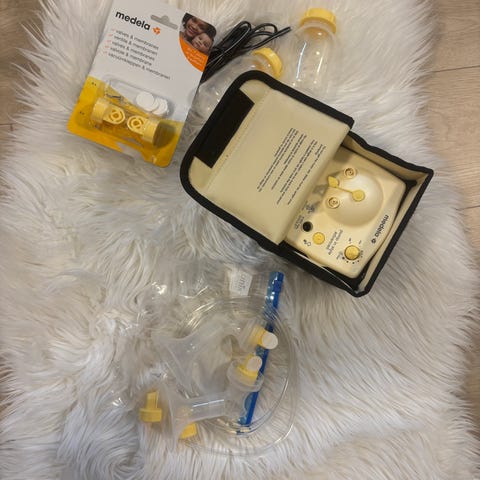 Medela elektrisk brystpumpe med flere tilbehør inkludert flasker, flaskesmokker, ventiler og slanger. Utstyrt med pumpeenhet og tilkoblingsslanger. Designet for å hjelpe med pumping og oppbevaring av morsmelk.