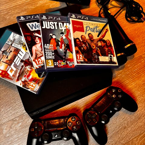 Sony PlayStation 4 spillkonsoll med tilhørende kontroller og spill. Just dance spill. Konsollen er svart og har standard design. Inkluderer en DualShock 4 trådløs kontroller, en ekstra enhet (muligens en bevegelsessensor), strøm- og tilkoblingskabler, samt et spill i original emballasje. Det er også kamera som kun er brukt få ganger med just dance