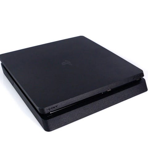 Sony Playstation 4 spillkonsoll i svart med tilhørende kontroller. Konsollen har standard design og inkluderer en trådløs kontroller.